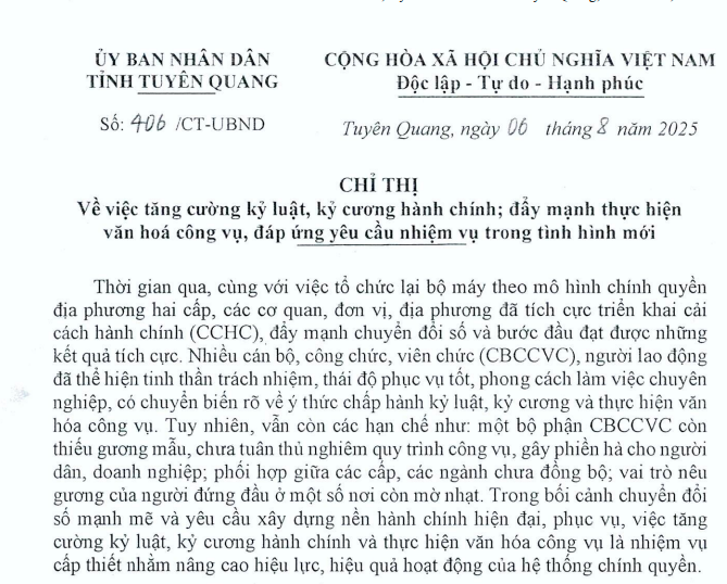 Chỉ thị về việc tăng cường kỷ luật, kỷ cương hành chính; đẩy mạnh thực hiện văn hóa công vụ, đáp ứng nhu cầu trong tình hình mới