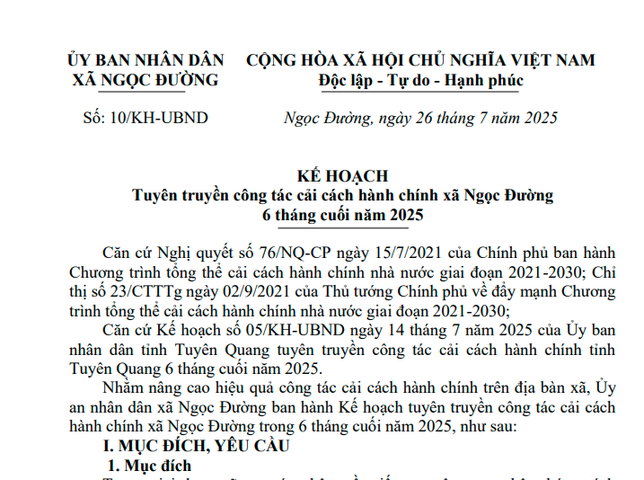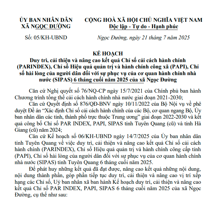 Kế hoạch duy trì, cải thiện và nâng cao kết quả Chỉ số PAR INDEX, PAPI, SIPAS 6 tháng cuối năm 2025 của xã Ngọc Đường