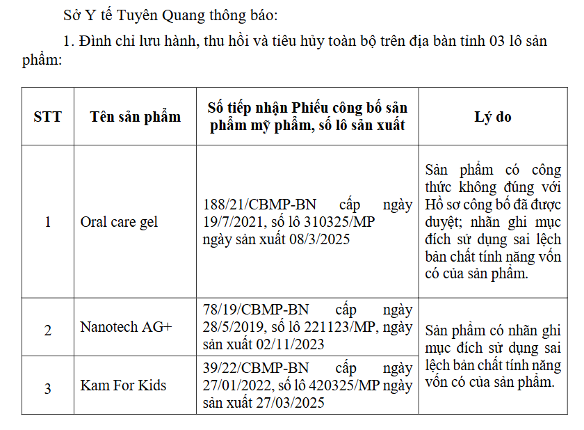 Thông báo Về việc đình chỉ lưu hành, thu hồi mỹ phẩm