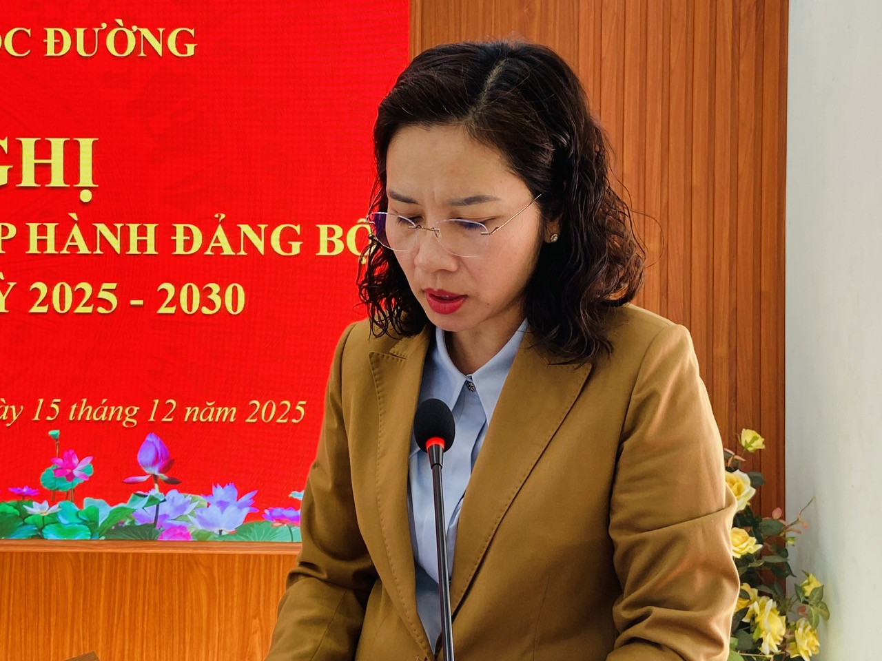 Đồng chí Nguyễn Thị Ánh Tuyết, Phó Bí thư Thường trực Đảng ủy xã thông qua dự thảo báo cáo kết quả công tác lãnh đạo, chỉ đạo xây dựng Đảng, hệ thống chính trị năm 2025, phương hướng, nhiệm vụ trọng tâm năm 2026