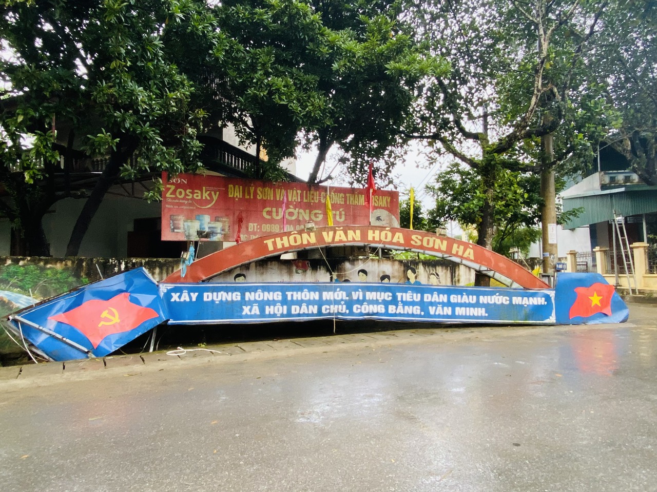 Thời điểm xảy ra sự việc vào khoảng gần 22h ngày 17/12, một chiếc xe tải khi di chuyển qua đường Sơn Hà, đến khu vực cổng chào thôn đã va quệt vào công trình này khiến công trình không trụ vững và sập hẳn một bên, đổ xuống chắn lối đi, làm gián đoạn giao thông cục bộ. Rất may, vụ việc không gây thiệt hại về người.