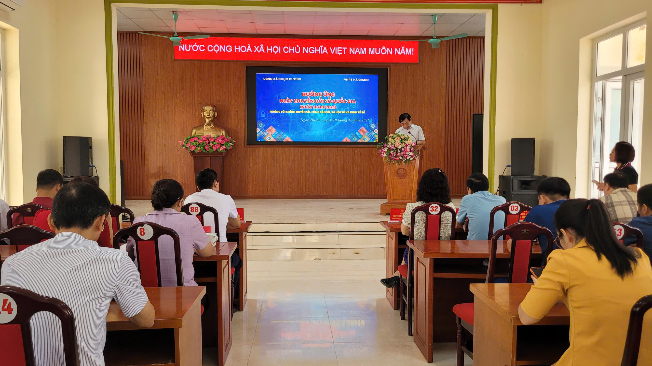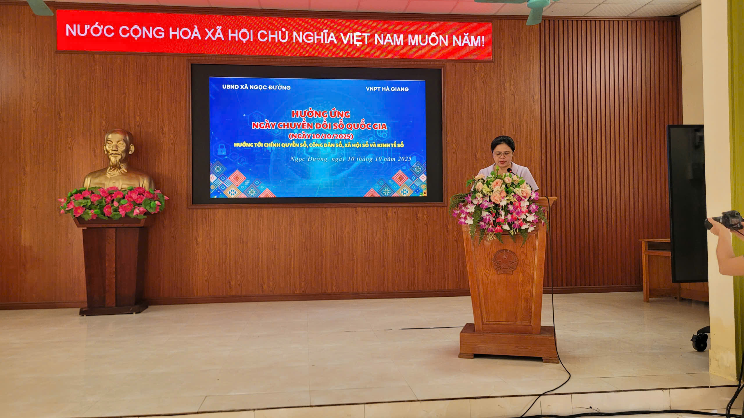 Phát biểu khai mạc, đồng chí Bùi Thị Na – Phó Chủ tịch UBND xã Ngọc Đường nhấn mạnh: chuyển đổi số là xu thế tất yếu của thời đại, là động lực quan trọng thúc đẩy phát triển kinh tế - xã hội và nâng cao chất lượng phục vụ Nhân dân. Xã Ngọc Đường xác định mục tiêu: “Mỗi người dân là một công dân số, mỗi gia đình là một hộ số, mỗi xã là một xã số.”
