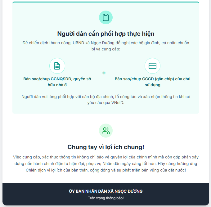 Người dân phối hợp với cán bộ địa chính, tổ công tác cấp xã khi được hướng dẫn thu thập thông tin; đồng thời xác nhận, bổ sung thông tin khi có yêu cầu qua ứng dụng VNeID.
