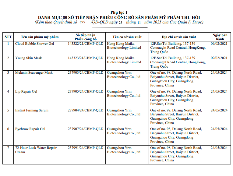Thu hồi số tiếp nhận Phiếu công bố sản phẩm mỹ phẩm và đình chỉ lưu hành, thu hồi sản phẩm mỹ phẩm